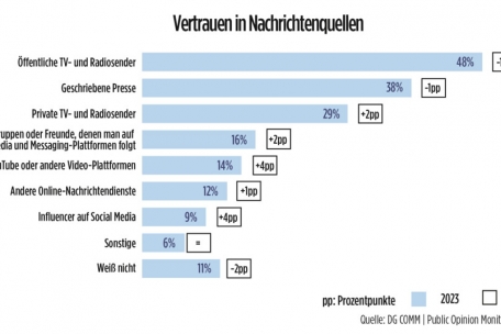 „Welche Medien genießen das größte Vertrauen?“, war eine weitere Frage, die bei der Umfrage gestellt wurde und zu der maximal drei Antworten gegeben werden konnten. Hier haben die öffentlichen Fernseh- und Radiostationen die Nase vorn. 48 Prozent der Befragten vertrauen den staatlichen Medien. Großes Vertrauen haben die Befragten aber auch mit 38 Prozent in die Zeitungen inklusive ihrer Online-Auftritte. Den privaten Fernseh- und Radioanstalten schenken noch 29 Prozent der Befragten in der EU ihr Vertrauen, wenn es um Nachrichten geht. Den Akteuren in den sozialen Medien vertrauen jedoch nur mehr 16 Prozent, YouTube und andere Plattformen kommen auf einen Wert von 14 Prozent.