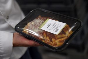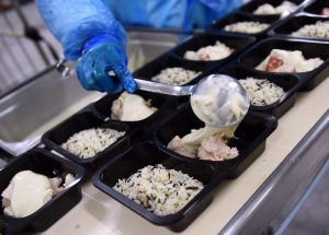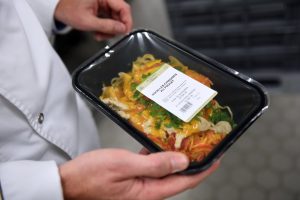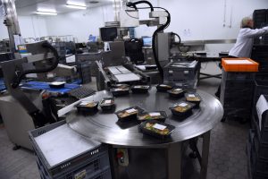 Wie in der Küche herrscht auch bei der Verpackung fokussiertes Arbeiten. Die Mitarbeiter portionieren genau die vorher zubereiteten Zutaten und platzieren sie in die Schalen. An der nächsten Station schweißt eine Maschine die Behälter mit einer durchsichtigen Folie zu und klebt ein kleines Etikett darauf. „Das Produkt spricht für sich“, sagt Hotschnig zur schlichten Präsentation.