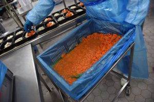 Nach der Verpackung werden die Schalen sorgfältig in die Transportbehälter gelegt, damit nichts verrutscht und das Gericht im Supermarkt noch appetitlich ausschaut. Vor der Auslieferung gehen die Fertiggerichte noch einmal, bildlich gesprochen, auf die Skipiste, denn im Kühlraum herrschen rund zwei Grad Raumtemperatur. Kurz darauf treten sie die Reise zum Supermarkt an.