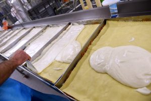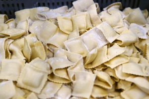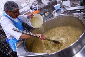 In riesengroßen Töpfen werden Soßen und Suppen gekocht, mit überdimensionalen Schneebesen gerührt. An einem anderen Posten werden in großen Blechen im Akkord Lasagneblätter mit der hausgemachten Hackfleisch-Tomatensoße belegt. Wieder folgen Lasagneplatten, die wie alle Pastasorten und fast alle Zutaten für die Fertiggerichte in dieser Küche hausgemacht sind.