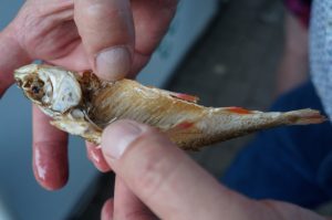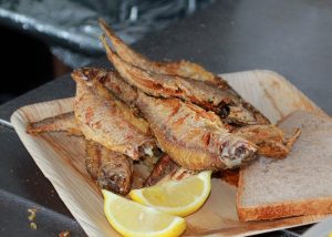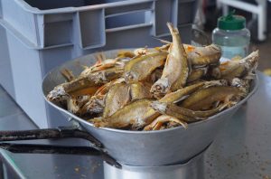 Die Degustation der „Friture“ lassen wir uns natürlich nicht entgehen. Gilbert Ruppert gesellt sich noch einmal zu uns. „Das A und O bei der ‚Friture‘ ist ein absolut sauberer Fisch“, erklärt er. „Die Fische kommen frisch geputzt bei uns an. Der ‚Club des jeunes’ hat jedoch gestern jedes einzelne Exemplar noch einmal mit der Zahnbürste gereinigt und anschließend getrocknet. Ein Plus in puncto Qualität und es hält das Frittierfett lange sauber.“