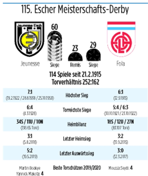 Heiß auf die Revanche ist vor allem Fola-Stürmer Stefano Bensi, der wieder genesen ist und am vergangenen Spieltag gegen Petingen den wichtigen ersten Treffer erzielte. Zudem traf kein Spieler öfter im Escher Derby in den vergangenen Jahren als Bensi. Unterstützung soll er morgen vor allem von Moussa Seydi bekommen, der bereits vier Tore auf seinem Konto hat. Zugute kommt dem Fola-Angriff, dass die Jeunesse-Abwehr mit elf Gegentoren bisher alles andere als sattelfest war.
