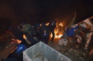Sie rücken früh am Tage an, um „aufzuräumen“: Gendarmen mit Helmen und Schutzschilden entfernen Holzpaletten, Reifen und Felgen, die rund um einen Lagerplatz aufgeschichtet sind.