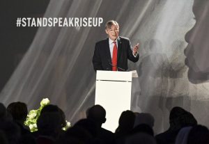 Eine andere „Survivor“, eine Frau aus Irak, sagt: „Wieso lache ich? Weil ihr mir ein Gefühl von Menschlichkeit vermittelt.“ Applaus aus dem Saal. Sie war Opfer der Terrormiliz Islamischer Staat. Sie sieht sich als Repräsentantin der Iraker und sagt, dass 3.000 Menschen verschwunden seien. Ihr Anliegen ist es, die Kinder, die ihnen abgenommen wurden und jetzt in IS-Familien leben, dort wieder herauszuholen. „Wenn ich von euch eine Genehmigung bekomme, dies zu tun, dann habe ich keine Angst, und werde die Kinder da rausholen.“ In ihrer Stimme hört man die Verzweiflung, aber vor allem die Wut auf die Ungerechtigkeit. Sie sagt, dass 1.700 Menschen dort psychische und physische Hilfe brauchen. Und Wohnraum. Jesidinnen leben in Zeltlagern. „Jedes Mal, wenn ein Zelt brennt, stirbt ein Kind, eine Frau oder ein junger Mann. Wie lange noch?“ Sie sagt, dass sie nicht genug Worte hat, um den Schmerz zu beschreiben. „Eure Menschlichkeit ist unsere Hoffnung.“