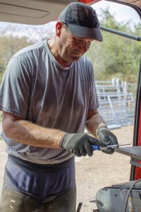 Mit einer Zange schneidet Saeul die Hufe der Esel zurecht. „Der Winkel muss genau angepasst werden, je nachdem welche Arbeit das Tier verrichtet, ob es springt, zieht oder geritten wird. Das tut natürlich nicht weh, es ist genau so, als ob wir Menschen uns die Nägel schneiden. Richtig machen muss man es trotzdem.“ Während der dreijährigen spezialisierten Ausbildung zum Hufschmied ist die Anatomie von Pferden, Eseln und Maultieren eines der wichtigsten Themen, um nachher eine artgerechte Pflege zu garantieren.