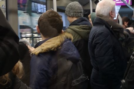 Ein Junge im T-Shirt spielt mit seinem Handy, seine Finger trommeln auf das Display, als würden sie zittern. Ein eleganter junger Mann mit dünnrandiger Brille, violettem Schirm und Halstuch liest ein Buch. Sein Sitznachbar schreibt etwas auf die angelaufene Scheibe. „F“ und „M“ kann man lesen, dann verschwindet die Schrift wieder. Die orangefarbenen Türen machen das Wetter draußen deutlich besser, als es ist. Nach jeder Station ertönt über den Lautsprechern Werbung: „Ab dem 1. März ist der öffentliche Verkehr gratis!“