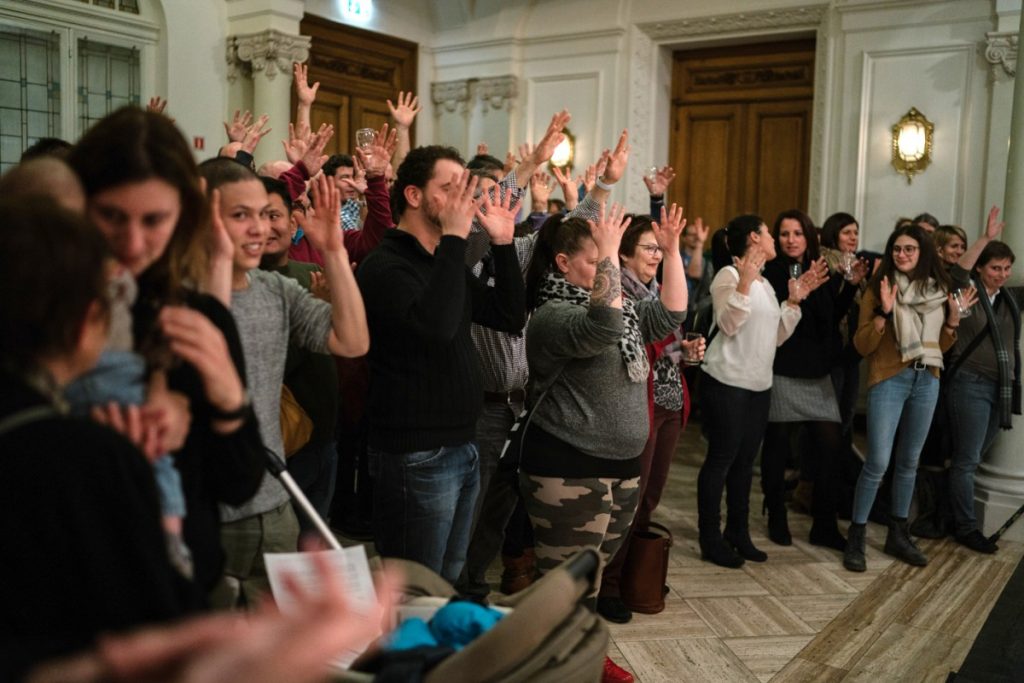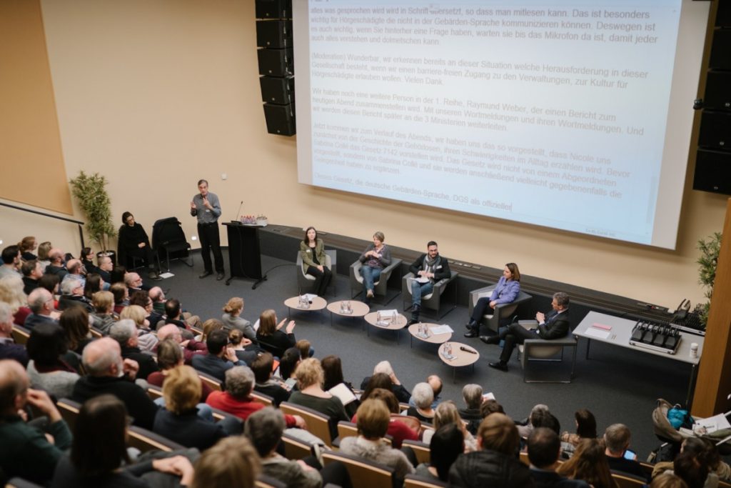 Zurzeit trägt ihr Verein derartige Informationen auf seiner Homepage (daaflux.net) zusammen. Dass viele Erläuterungen nicht auf Deutsch abrufbar seien, stelle eine zusätzliche Barriere dar, die es zu durchbrechen gelte, so Sibenaler. Sie erntete reichlich Zuspruch vom Publikum, nicht zuletzt auch, weil sie im Gespräch nicht lockerließ. In diesen Momenten zeigte sich, dass auch ein geräuschloser Applaus unglaublich laut sein kann. Immer wieder hielten nämlich mehr als die Hälfte der im Raum Anwesenden beide Arme hoch und wedelten mit den Händen. Da Menschen mit einer Hörschädigung Klatschen häufig nicht akustisch vernehmen können, gilt eben diese, in vielen Ländern geläufige, Geste als Akt der Zustimmung, der klar visuell wahrnehmbar ist.