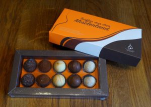 Wir entdecken eine besondere Leckerei an der Theke: Trüffel aus dem Miselerland! Wir fragen nach der Herkunft und was es damit auf sich hat. „Zum zehnjährigen Jubiläum hatten wir die Idee, unseren Kunden einen besonderen Gaumenschmaus zu offerieren“, erklärt Camille Duhr. „Jeder der fünf Betriebe hat seinen besten Brand zur Verfügung gestellt und der Patissier-Chocolatier Hoffmann aus Wormeldingen hat fünf verschiedene Trüffel mit unterschiedlichen Schokoladen daraus kreiert.“