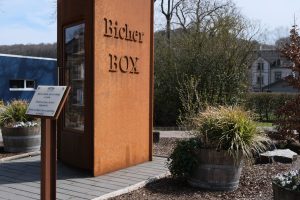 Kaum eine größere Entfernung zu Fuß, Poiré schiebt sein Rad, wo der Bürgermeister nicht auf etwas aufmerksam macht, das neu ist oder in Planung. Die „Bicher-Box“ gegenüber der Kirche hat ein Mitarbeiter der Gemeinde entworfen und schließlich gebaut. Genauso wie die „Give Box“ im Hinterhof des provisorischen Container-Rathauses, wo Einwohner Sachen abgeben können, die sie nicht mehr brauchen.