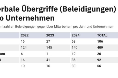 Insgesamt kam es also im Jahr 2024 zu 411 Übergriffen auf Mitarbeiter im öffentlichen Verkehr. Zum Vergleich: Im Jahr 2023 waren es 331 Fälle und im Jahr 2022 insgesamt 240.