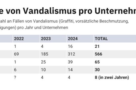 Auch beim Vandalismus lässt sich eine steigende Tendenz beobachten. Der Begriff umfasst Taten wie Graffiti, vorsätzliche Beschmutzung und Beschädigungen. Insbesondere bei der CFL sind die Zahlen regelrecht explodiert. Während es 2022 noch 69 Fälle waren, stieg die Zahl im Folgejahr auf 185 und 2024 sogar auf insgesamt 312 Fälle. Auch bei Luxtram sind die Zahlen deutlich gestiegen: war es 2022 nur ein einziger Fall, so kam es 2024 zu insgesamt 39 Fällen.