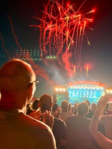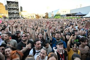 Visuell blieb die Band an dem Abend ihrem Konzept treu: riesige Projektionen, eine aufblasbare Hand mit Herzgranate vom „American Idiot“-Albumcover, Pyroeffekte – alles wirkte durchgeplant, fast schon steril. Es fühlte sich manchmal überzeichnet an, blieb aber dennoch authentisch. Ein Blick in die Menge zeigte eine beeindruckende Mischung: Unter den Besuchenden befanden sich welche, die vermutlich mit Green Day aufgewachsen sind. Manche schienen das erste Mal einem Konzert der Band beizuwohnen, weitere waren schwerer zuzuordnen, darunter Eltern mit Teenager-Kindern oder Millennials mit verwaschenen Tour-Shirts. Einzelne sangen jede Zeile mit, als hinge ihr Leben daran. Andere wirkten, als wollten sie einfach Teil des Moments sein.
