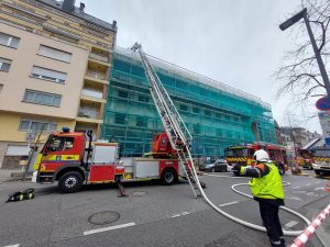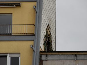 Isolationsmaterial an der Mauer zum Nachbargebäude hatte Feuer gefangen. Dieses fraß sich dann langsam zwischen den Wänden weiter nach unten. Ein großes Feuer war nicht zu sehen. Bis gegen 17h schien die Feuerwehr die Lage unter Kontrolle gebracht zu haben.