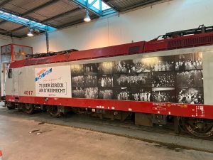 Die grau-rot lackierte CFL-Lokomotive mit der Nummer 4017 ist ein echter Hingucker. Großformatige Schwarzweißfotos sind auf beiden Seiten der Maschine aufgeklebt und dazu die Aufschrift „75 Joër zeréck an d’Heemescht, mir vergiessen net“. Bereits seit dem 23. Oktober ist die E-Lok im History-Look unterwegs.