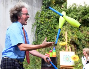 Ähnlich skurril gestalteten sich die Nummern von Jongleur „Jonn Happi“ aus dem Norden des Landes und Blumenflüsterin „Clochette“, die bewaffnet mit löchrigen Wasserbehältern im „grande finale“ des Spektakels versuchte, ihre geknickte Sonnenblume wieder zum Leben zu erwecken. Insgesamt acht Artisten präsentierten bei der Veranstaltung ihre Kreativität auf dem Rasen und entlockten Jung und Alt so manches Grinsen. Neben größtenteils witzigen Nummern wurde auch echte Akrobatik geboten. Eine Premiere lieferte dabei die Aerial-Silk-Künstlerin Morgane, die sich grazil an ihren Vertikaltüchern hochhangelte, um dann im spektakulären „Drop“ wieder schwebend über dem Boden zu landen. Begleitet wurden die Einlagen jeweils von drei Live-Musikern, die mit Trompete, Gitarre und Akkordeon für die nötige Spannung sorgten.