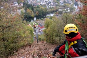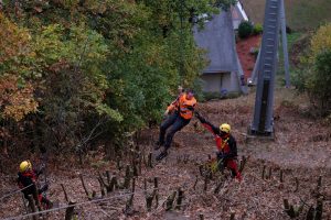 Besonders für die Neuen der Truppe ist die Übung sehr wichtig. Zwölf der insgesamt 23 Mann starken „Groupe de reconnaissance et d’intervention en milieu périlleux” aus der Hauptstadt waren am Dienstagmorgen in Vianden im Einsatz. Außerdem wurde die Zusammenarbeit mit den lokalen Kräften geprobt. Auch wenn die Höhenretter den größten Teil der Arbeit eines solchen Einsatzes schultern müssten, sei die örtliche Feuerwehr für die Unterstützung unverzichtbar. Die Nachbarn aus dem Einsatzzentrum Diekirch nahmen mit ihrer Drehleiter und einem Krankenwagen ebenfalls an der gestellten Rettungsaktion teil.