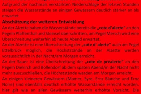 Die aktuellen Vorhersagen deuten auf eine Überschreitung der „cote de préalerte“ entlang der Alzette ab dem Nachmittag bis in die Nacht hinein an den Pegeln Hesperingen, Pfaffenthal, Steinsel, Mersch und möglicherweise Ettelbrück. An den Pegeln Hesperingen, Pfaffenthal und möglicherweise Steinsel können die Wasserstände auch bis in den Bereich der „cote d’alerte“ steigen.