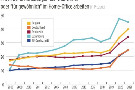 Zu den drei Ländern, in denen die Quote letztes Jahr nicht gestiegen ist, zählten Luxemburg, Polen und Österreich. Rückläufig war hierzulande die Zahl der Menschen, die „manchmal“ im Homeoffice arbeiten. Ihr Anteil an den Erwerbstätigen ist von 24,4 Prozent (im Jahr 2020) auf nur noch 17 Prozent im Jahr 2021 gefallen, unter das Niveau von vor Corona. Deutlich gestiegen ist derweil der Anteil an der arbeitenden Bevölkerung, die „für gewöhnlich“ von zu Hause aus arbeiten (von 23,1 auf 28,1 Prozent). Das ist zwei bis drei Mal mehr als in den Jahren vor Corona.
