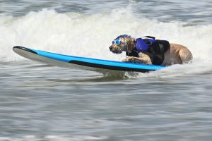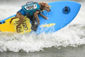 Statt ums Stöckchen holen geht es bei diesem Hunde-Wettbewerb ums Surfen auf vier Pfoten: Mehrere Vierbeiner haben beim diesjährigen Hunde-Surf-Wettbewerb an einem kalifornischen Strand Stehvermögen und Stil bewiesen, wie der Veranstalter und mehrere US-Medien berichteten. Mit Schwimmwesten und kreativen Kostümen düsten die Tiere demnach auf ihren Brettern über die Wellen.