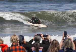 Hunde mit Schwimmwesten gleiten über die Wellen Kaliforniens und werden dabei von ihren Besitzern und Fans bejubelt. Es ist ein etwas kurioser Wettkampf, der nicht zum ersten Mal stattfindet.