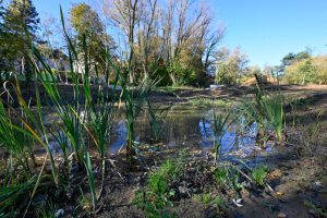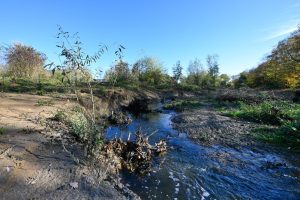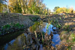 Auch bei Überschwemmungen zahlte sich die Renaturierung bereits aus. Das neue Biotop ist schließlich nicht nur als Naherholungsziel für die Anwohner gedacht, sondern erfüllt wichtige Funktionen bei der Resilienz gegen durch den Klimawandel ausgelöste Extremwetterphänomene. „Bei dem vielen Regen vor zehn Tagen hat sich die Renaturierung schon bewährt. Das Wasser ist aus dem Flussbett getreten und konnte sich ausbreiten“, erzählt Zimmermann. Dort, wo die Dipbech eigentlich einen Meter breit ist, stand das Wasser 20 bis 25 Meter weit in der Natur. Die Überschwemmungen verzögerten allerdings auch ein wenig den Fortgang der Arbeiten, denn das Wasser fließt aufgrund des lehmigen Bodens kaum ab.