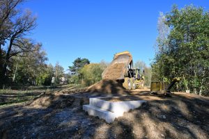 Der Bagger rollt auch am Montagmorgen. Nachdem er seit Januar eingesetzt wurde, um das neue Flussbett der Dipbech am Rand der Escher Nonnewisen anzulegen, bereitet er nun das Terrain für die Installierung der drei neuen Passerellen vor. In gut zwei Wochen sollen sie geliefert werden, die Fundamente stehen bereits. Nun müssen die Plattformen vorbereitet werden, auf denen der Kran stehen wird, der die Brücken in Position bringen wird. Die Passerellen sind auf HQ100 ausgelegt, wobei HQ100 ein Hochwasserereignis ist, das im statistischen Mittel einmal in 100 Jahren eintritt. Nur ein Jahrhunderthochwasser kann die Brücken demnach unter Wasser setzen.