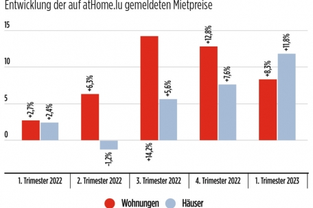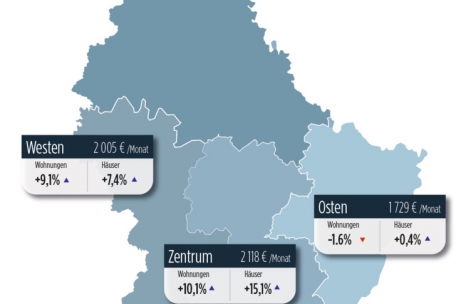 Auf die Regionen aufgeschlüsselt, liegt die Durchschnittsmiete im Zentrum bei 2.118 Euro, im Norden bei 1.384 Euro, im Süden bei 1.564 Euro, im Osten bei 1.729 Euro und im Westen bei 2.005 Euro. Im Zentrum steigen die Mietpreise um 10,1 Prozent bei Wohnungen und um 15,1 Prozent bei Häusern. Im Norden sind es vor allem die Mietpreise der Wohnungen, die deutlich, mit einem Plus von 19,7 Prozent, ansteigen. Bei Wohnungen sind es „nur“ 6,8 Prozent. Im Süden verbuchen jedoch nur Wohnungen ein Plus von 10,9 Prozent. Die Mietpreise für Häuser sind im „Minett“ nämlich um 1,4 Prozent gesunken. Im Osten gab es bei den Mietpreisen die geringste Bewegung, mit einem Minus von 1,6 Prozent bei Wohnungen und einem Plus von 0,4 Prozent bei Häusern. Im Westen allerdings liegt das Plus bei Wohnungen bei 9,1 Prozent und bei den Häusern bei 7,4 Prozent.