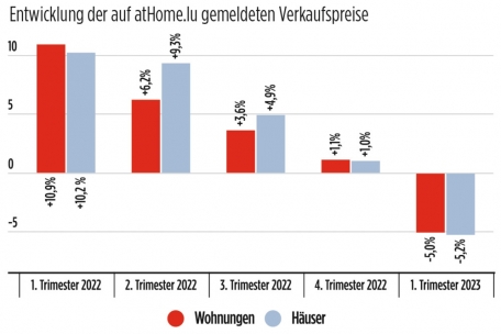 Luxemburgs Immobilienpreise sinken. Das meldete „athome.lu“ am Dienstagmorgen online und bezog sich dabei auf die Preise, die auf seiner Webseite ausgeschrieben sind. Die gemeldeten Preise für Wohnungen seien im Vergleich zum Vorjahresquartal um fünf Prozent zurückgegangen – bei Häusern verzeichnete die Immobilienplattform einen Rückgang von 5,2 Prozent. Insbesondere neue Immobilien seien mit einem Minus von 7,4 Prozent von der Dynamik betroffen. Bei alten Gebäuden liege der Rückgang bei „nur“ 3,9 Prozent.