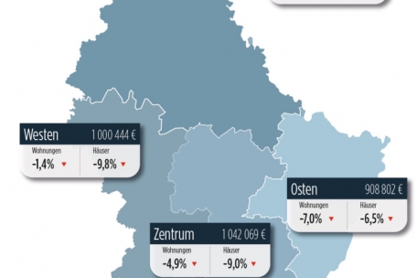 Aufgeteilt in die fünf Regionen, stellt „atHome“ Folgendes fest: Im Zentrum liegt der durchschnittliche Immobilienkaufpreis nun bei 1.042.069 Euro. Bei den Wohnungspreisen wird ein Rückgang von 4,9 Prozent verzeichnet, bei Häusern liegt der Rückgang sogar bei neun Prozent. Im Norden kostet eine Immobilie im Durchschnitt 767.211 Euro. Auch im Ösling gehen die Preise bei den Wohnungen um 4,3 Prozent zurück. Doch bei den Häusern schnellen die Preise mit einem Plus von 10,2 Prozent weiter in die Höhe. Im Süden ist der Rückgang der Preise am geringsten. Hier liegt der Durchschnittsverkaufspreis bei 750.006 Euro – bei den Wohnungen stellt „atHome“ ein Minus von 2,2 Prozent fest, bei den Häusern ein Minus von 3,6 Prozent. Im Osten liegt der Durchschnittspreis bei 908.802 Euro und es wird ein Rückgang von sieben Prozent bei Wohnungen und 6,5 Prozent bei Häusern verzeichnet. Im Westen dann sind es 1.000.444 Euro im Durchschnitt, minus 1,4 Prozent bei Wohnungen und minus 9,8 Prozent bei Häusern.