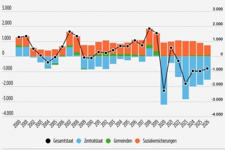 Deutlich höher ausfallen als bisher geplant sollen in den kommenden Jahren laut 100,7 die Defizite beim Zentralstaat (ohne Sozialversicherungen und ohne Gemeinden). In der Folge sollen auch beim Zentralstaat (bis wenigstens 2027) weiter Defizite erwirtschaftet werden. Laut den Rechnungen sollen sie höher ausfallen als erwartet. Am Trend ändert sich derweil nichts. Bereits in dem im vergangenen Jahr gestimmten Staatshaushalt waren Defizite eingeplant.