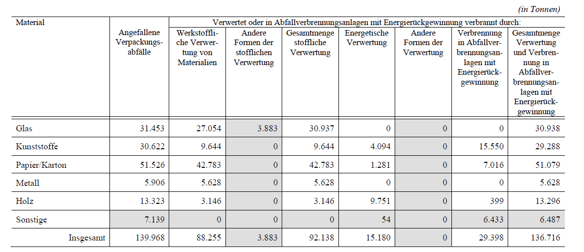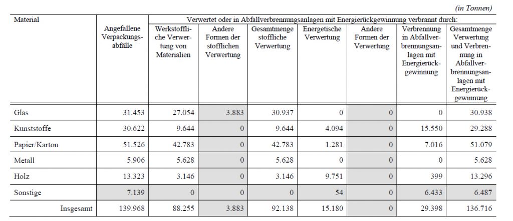 Schade dass die Tabelle nicht näher auf die Art der werkstofflichen Verwertung eingeht. Nach dem Modell der Kreislaufwirtschaft dürfte es kein Downcycling geben. Es bleibt viel zu tun!