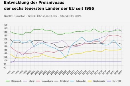 2016 hat Luxemburg Finnland vom Platz des viert-teuersten Landes der EU verdrängt. 2018 sind die Luxemburger Preise an denen Schwedens vorbeigezogen. Seitdem liegt das Großherzogtum unangefochten auf Platz drei.