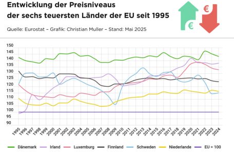 Im Jahr 2012 sah die Liste noch etwas anders aus: Hinter Dänemark auf Platz eins folgten damals Schweden und Finnland. Luxemburg belegte Rang vier. Im Jahr 2013 fiel Luxemburg dann sogar auf den fünften Platz der teuersten Länder in der EU zurück. Irland hatte das Großherzogtum überholt. Und während Irland in den folgenden Jahren in dem Ranking immer weiter aufstieg (seit 2017 auf Platz zwei), legten die (relativen) Preise in Luxemburg bis 2020 schnell zu. In den Folgejahren sind sie, verglichen mit dem EU-Durchschnitt, leicht rückläufig gewesen.