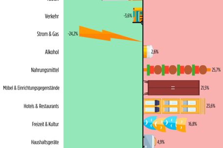 Deutlich über dem EU-Durchschnitt waren die Preise hierzulande jedoch auch in den Bereichen „stationäre Gesundheitsdienstleistungen“ (160,2 Prozent), „Möbel und Einrichtungsgegenstände“ (21,5), „Nachrichtenübermittlung“ (54,7 Prozent) sowie „Hotels und Restaurants“ (23,6 Prozent) und „Freizeit und Kultur“ (16,8 Prozent).