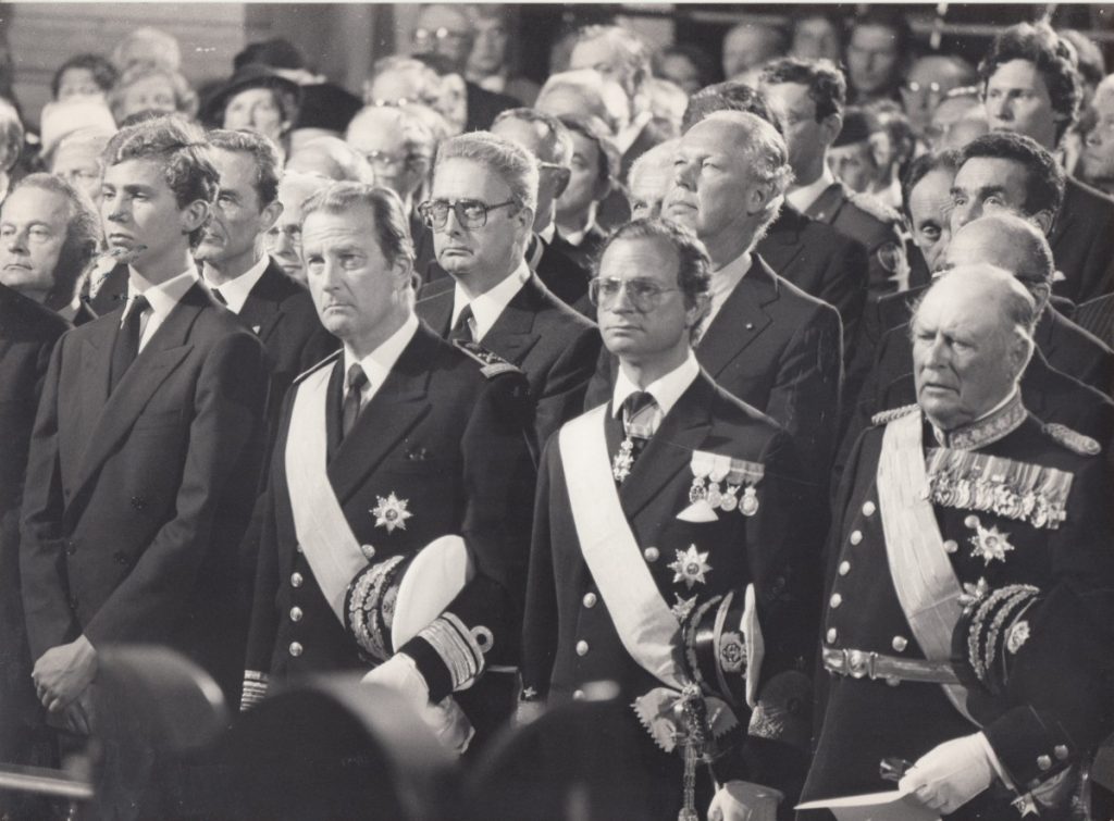 V.l.: der Prinz von Asturien, der Prinz von Lüttich, König Carl XVI. Gustaf von Schweden und König Olav V. von Norwegen