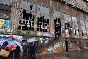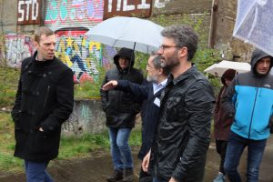 Bevor am Samstag die einzelnen Workshops ihre Arbeit aufnahmen, fand eine Besichtigung des seit über 40 Jahre brachliegenden Geländes und den Gebäuden statt, wobei sich die Teilnehmer vom Zustand und Potenzial der Industriegebäude ein Bild machen konnten. Es ist die industrielle Vergangenheit des Geländes, das dieses Projekt einmalig macht. Planer und Bürger waren sich einig, dass diesen Industriegebäuden eine neue Funktion zugeordnet werden muss, die in dem gesamten Kontext bestehen kann.
