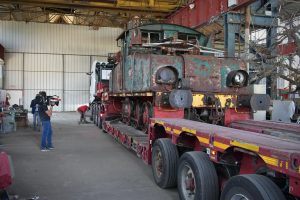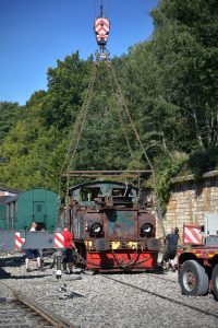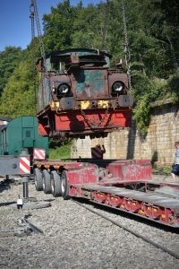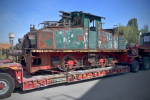 Kurz nach Mittag und bei strahlendem Sonnenschein wurde die Elektrolok ADU N. 6 gestern von einer belgischen Spezialfirma mit einem Kran auf einen Anhänger gehoben und dann per Schwertransport nach Düdelingen gebracht. Die Route führte durch Differdingen, dann ging es weiter über die Südautobahn A13 bis nach Düdelingen. Der Transport ging ohne Schwierigkeiten über die Bühne und die Spezialisten brauchten nicht mal eine Stunde, um die Strecke zu bewältigen.