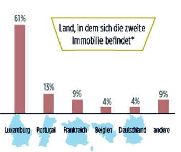 Dass die Haushalte im Besitz von Reserve-Grundstücken sind, damit der Nachwuchs auch ein Haus bauen kann, kommt eher seltener vor. Nur neun Prozent der Haushalte gaben ein Grundstück als wertvollste Zweitimmobilie an. Interessant auch die Übersicht über die Länder, in denen sich die wertvollsten Zweitimmobilien befinden. An erster Stelle liegt ganz klar Luxemburg mit 61 Prozent der Befragten. Mit abgeschlagenen 13 Prozent folgt Portugal auf dem zweiten Platz. Am belgischen Strand haben demnach weniger als vier Prozent der Luxemburger eine zweite Wohnung.