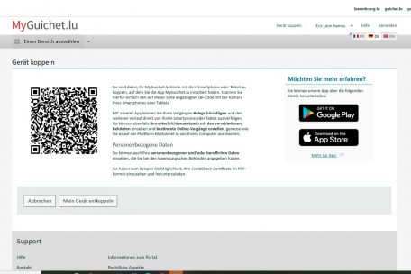 Nutzer müssen über ein bereits bestehendes MyGuichet-Konto verfügen und dieses mit der App verbinden. Dabei hilft die Funktion „Koppeln Sie Ihr Gerät“, die gleich beim ersten Start angezeigt wird. Zuvor müssen aber noch die Nutzungsbedingungen akzeptiert werden.