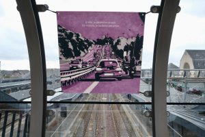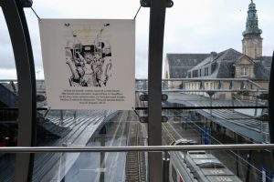 Auch in der Passerelle, die von der CSL zum Bahnhof führt, hängen rund 28 großformatige Reproduktionen der Illustrationen – vor der passenden Kulisse ankommender und abfahrender Züge. Mitten im Strom der Pendler*innen steht der bedeutungsvolle Satz: „In einer Welt, in der Rennen zur Norm geworden ist, bleibt zu Fuß zur Arbeit zu gehen eine seltene, aber mächtige Freiheit.“