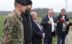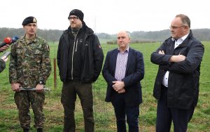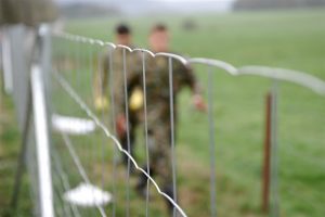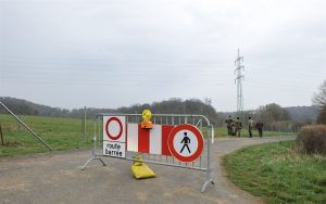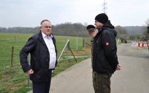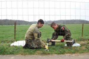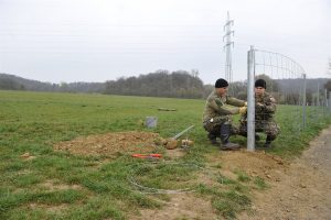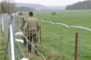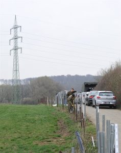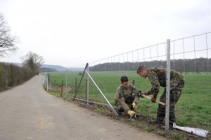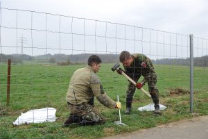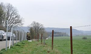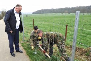 Rund 30 Mitarbeiter der Armee sind seit vergangenem Mittwoch dabei, einen Zaun entlang der belgischen Grenze zu errichten. 900 Meter stehen bereits, sagte Oberstleutnant Guillaume Hansen im Rahmen einer Pressekonferenz, die genau dort stattfand, wo der Zaun gegenwärtig errichtet wird. „Wir kommen gut voran. Der Zaun hat eine Höhe von 1,42 Metern und einen Drahtdurchmesser von 3 Millimetern“, sagt Hansen. Er leitet den Einsatz der Armee. Der Zaun wird anhand einer krallenähnlichen Vorrichtung im Boden regelrecht verankert, um die nötige Stabilität zu garantieren. Ein bisschen schwierig gestaltet sich die Installation der Tore, durch die Landwirte ihre vom Zaun abgetrennten Wiesen und Felder erreichen können.