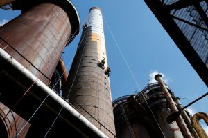 Ein paar Meter entfernt von der Ölförderpumpenhüpfburg ragt eine glimmende Zigarette in den grauen Himmel über Völklingen. „Ragt in den Himmel“ ist hier ausnahmsweise kein überstrapaziert-übertriebenes Bild, sondern: die verdammte Kippe ist tatsächlich turmhoch. Überschattet alles. Aus Kilometern Entfernung zu sehen. Der höchste Schornstein der ehemaligen Eisenhütte, ummantelt mit bemalten Papierbahnen, sodass er aussieht wie eine 70 Meter hohe, stehende Zigarette. Der französische Künstler The Wa hat dieses Werk geschaffen. Es trägt den Titel „Torches of Freedom“, Fackeln der Freiheit. Mit diesem Begriff wurden Frauen Anfang des 20. Jahrhundert zum Rauchen aufgefordert – damals Tabu und Befreiungsakt, heute Gesundheitsrisiko. „Manchmal werden den Leuten die falschen Träume verkauft“, sagt The Wa. Und schafft den Bezug zur Industrialisierung: „Manchmal wird eine ganze Stadt um diesen Traum herumgebaut und dann allein gelassen.“