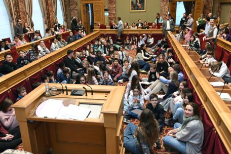 Die Luxemburger Chamber wirkt an diesem Freitagmorgen weniger wie ein Parlament als wie ein lebendiges Klassenzimmer. 134 Kinder zwischen acht und zwölf Jahren betreten um 9.30 den Plenarsaal, stellen ihre selbstgebastelten Pappfiguren ab und setzen sich – wortwörtlich – auf Augenhöhe mit jenen, die sich sonst über Gesetzestexte beugen. Chamber-Präsident Claude Wiseler hockt sich zu ihnen auf den Boden. „Kinder sagen ohne Scheu, was sie denken“, meint er später. „Und genau das brauchen wir hier.“