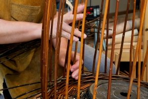 Und es geht um Systematik. Ein sternförmiger Kreuzboden, lange Staken für die Form, Flechtweiden für die Wände, der Rand und die Henkel sind die einzelnen Arbeitsschritte. Die häufigsten Fehler passieren gleich am Anfang, wenn die Entscheidung fällt, wo welche Äste eingesetzt werden. Jacqué fühlt das, wenn sie die Äste in die Hand nimmt. „Ein Flechter schaut mit den Händen“, sagt sie.