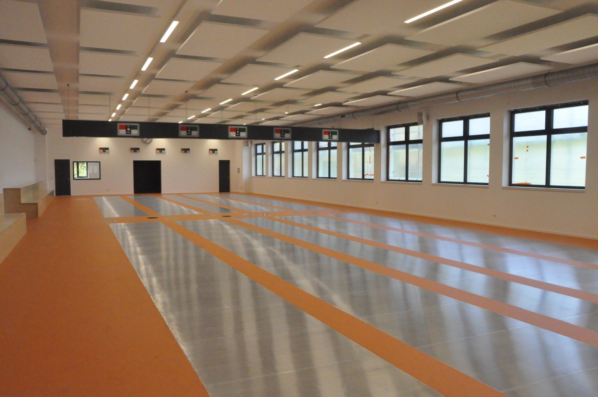 Der Boden der Fechthalle ist in Orange gehalten. Die Wände sind weiß. Die ganze Halle wird mit Sonnenlicht durchflutet. „Die Fenster wurden zur Nordseite hin angebracht. Wir vermeiden somit eine direkte Sonneneinstrahlung während des Trainings. Die Sonne würde sonst die Fechter stören“, erklärte der Präsident des Fechtklubs.