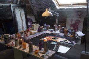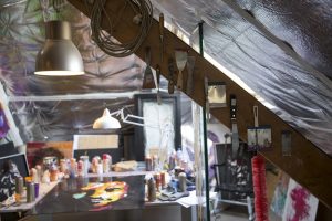 Das Erdgeschoss ist Showroom und Versammlungsraum zugleich, im Keller sind Farben und weitere Materialien gelagert. Hier befindet sich ebenfalls das Atelier von Daniel Mac Lloyd. Die beiden Garagen erlauben indes das Arbeiten an großformatigen Werken. Im zweiten Stockwerk befinden sich das Atelier von Raphael Gindt und ein Büro. Straßenkunst gehört eigentlich in den öffentlichen Raum, wo die beiden Künstler auch sehr aktiv sind. Raphael Gindt und Daniel Mac Lloyd haben parallel dazu den Weg zur Leinwand und zur Skulptur gefunden. Basismaterial bleiben aber Lackdosen, gearbeitet wird auch mit Pinsel und Spachtel.