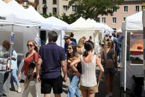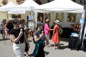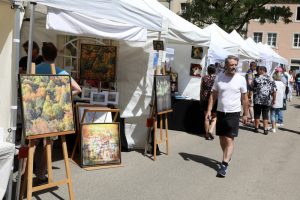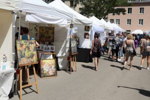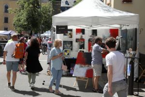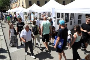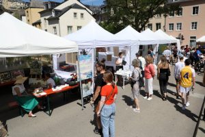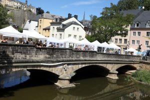 Die Alzette fließt gemächlich unter der Brücke im Grund hindurch, unter dem azurblauen Himmel glitzert das Flusswasser wie frische Ölfarbe auf einer Leinwand. Ein Ziehharmonikaspieler trottet beim Spielen über das sandsteinfarbene Pflaster, und obwohl die Uhr erst 10 Uhr anzeigt, verbreitet sich der Geruch nach Gegrilltem langsam zwischen den Verkaufsständen. Viele der anwesenden Künstler sitzen auf Campingstühlen vor den gerade aufgerichteten Pavillons und unterhalten sich, während sie herzhaft in ihr Picknick beißen.