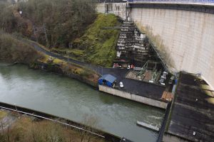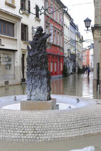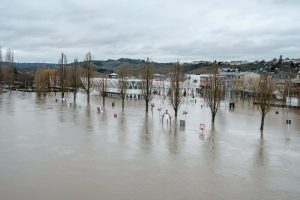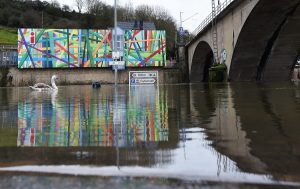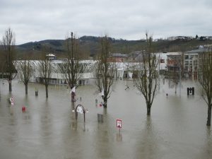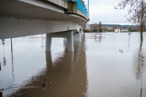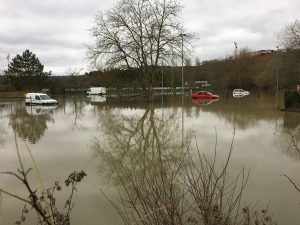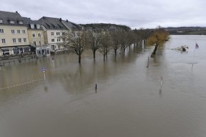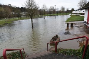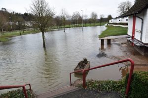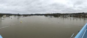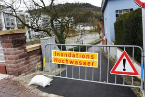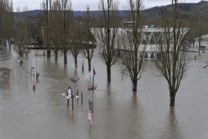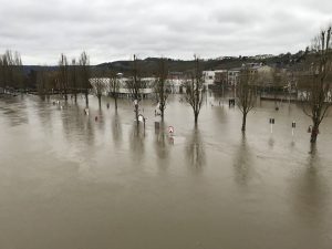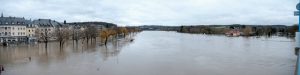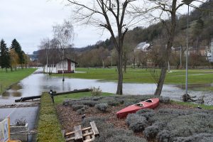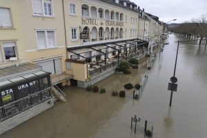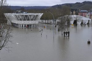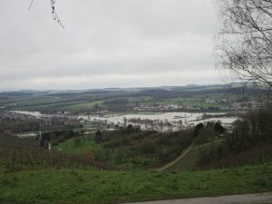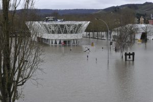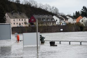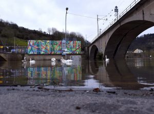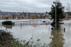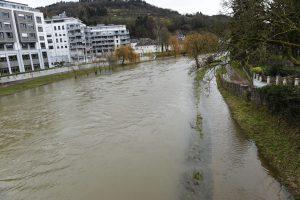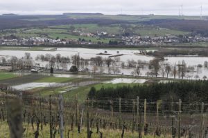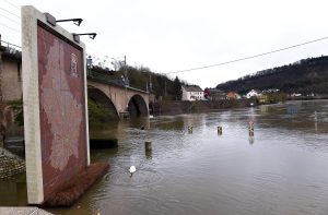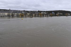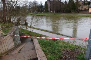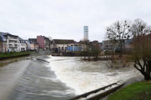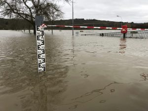 Wenn man den Berg hinab nach Remich fährt, ist der Weg nach rechts ins Zentrum hinein abgesperrt, sodass man nur noch über die Brücke Richtung Deutschland fahren kann. Wer von hier aus auf die Mosel herabschaut, dem wird erst einmal bewusst, wie hoch das Wasser gerade steht und wie reißend der Fluss ist. Das neue Bahnhofsgebäude sowie die Eispiste, die auf der „Esplanade“ in einem Zelt aufgebaut wurde, stehen knietief im Wasser und auch auf der deutschen Seite der Mosel sieht es nicht besser aus.