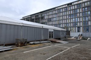 Ortswechsel. Gestärkt geht es für den Chef vom „Centre de soutien logistique“, Ben Baus, von Echternach nach Kirchberg zum Standort „Tony Rollman“. In der Nähe des Schwimmbades arbeitet das CGDIS nämlich seit einer Woche an einer großen Zeltunterkunft für Flüchtlinge. „Es gibt ein großes Zelt von 90 Metern Länge und ein kleineres von 60 Metern. Darin werden dann kleinere Zelte aufgestellt, um alles etwas abzutrennen. Sodass man hier in menschenwürdigen Bedingungen leben kann“, erzählt Baus, während er den Blick über das Gelände schweifen lässt, auf dem lange Zeit Baucontainer standen. Außerdem gibt es noch ein 30 Meter langes Zelt für die Essensversorgung sowie ein zweistöckiges Sanitärzelt von 30 Metern. Zwischen 400 und 500 Menschen sollen laut ONA während einem Jahr an diesem Standort unterkommen können.