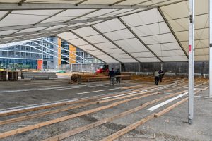 In den beheizbaren, aber auch klimatisierten Zelten auf Kirchberg gibt es auch WLAN. „Man fragt sich vielleicht, wie wichtig das überhaupt ist. Aber ich habe das schon in anderen Einrichtungen gesehen: Wenn man nicht weiß, ob der eigene Mann noch lebt, will man wenigstens erreichbar sein“, erklärt Ben Baus. Der Boden in den Zelten wird mit Linoleum in einer hölzernen Optik ausgelegt. „Ich will hier alles so ausstatten, dass ich auch mein eigenes Kind hier leben lassen würde“, meint dazu der 35-jährige Ben Gieres, der sich gemeinsam mit Ben Baus ein provisorisches Büro in einem Baucontainer auf dem Gelände eingerichtet hat.